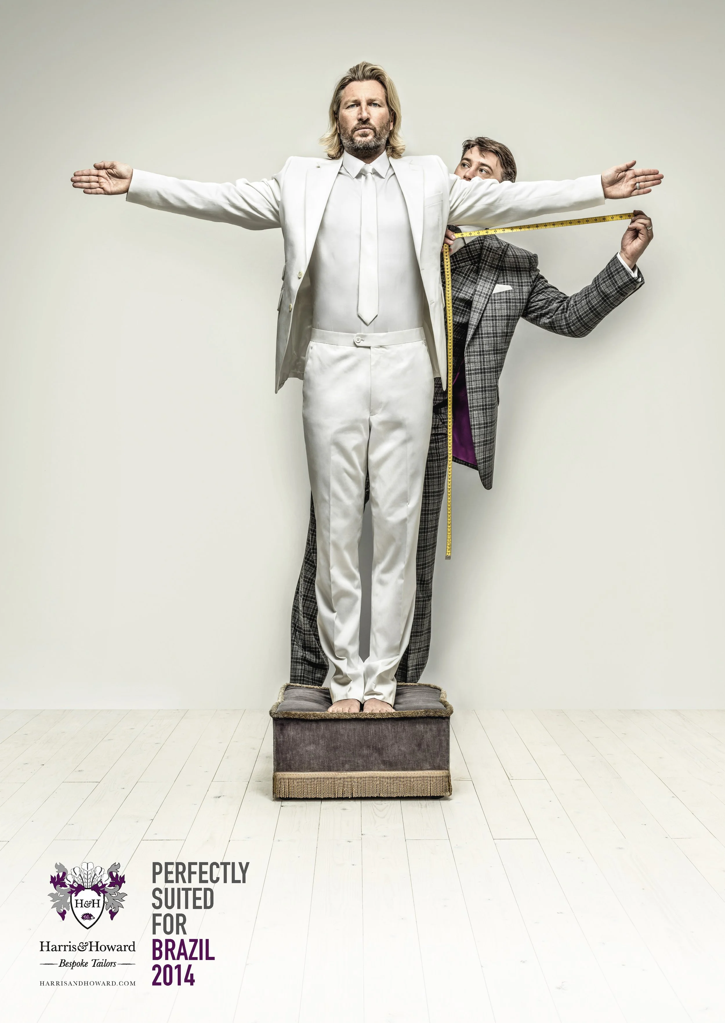 Insight: Harris & Howard Bespoke Tailors look after many footballer and celebrity clients including football TV pundit, Robbie Savage. When the World Cup 2014 in Brazil loomed, a brand promotion brief provided the perfect opportunity to feature Harris & Howard’s famous footballer client in an iconic Brazilian pose across posters, press and social media..